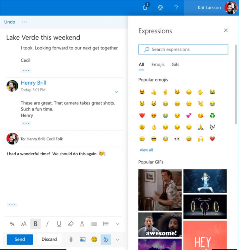 The new UI for Outlook has a new search bar and you will also be getting the preview of files and photos in the conversation directly. When you are typing a mail in the new Outlook experience it will be showing you Quick Suggestions for adding information easily. The update also offers more personalization that allows you to use a variety of emojis and GIFs in your messages. You can see all these from these images above.