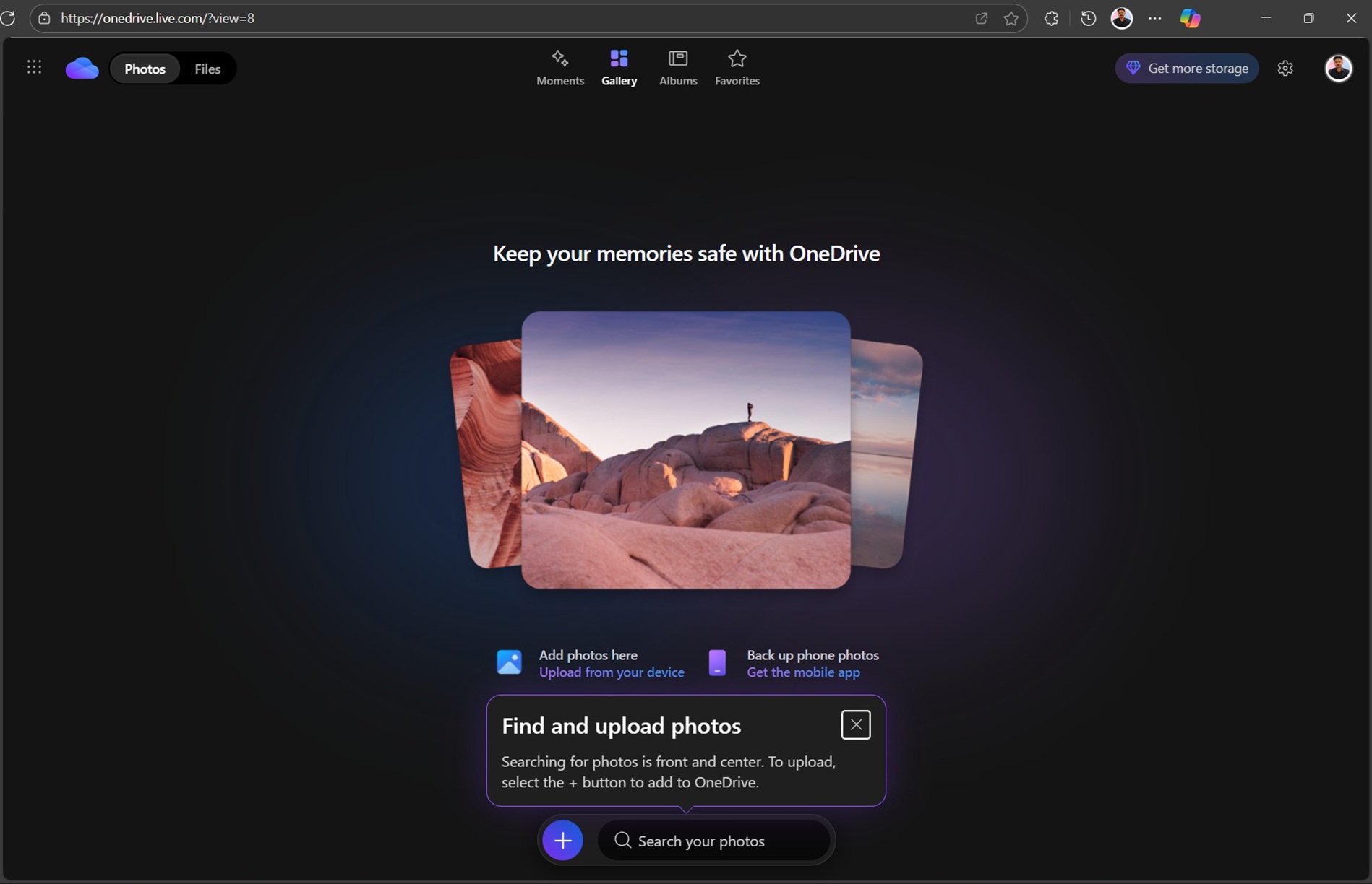 At the bottom, you’ve a floating search bar, and an option to upload more photos to OneDrive.