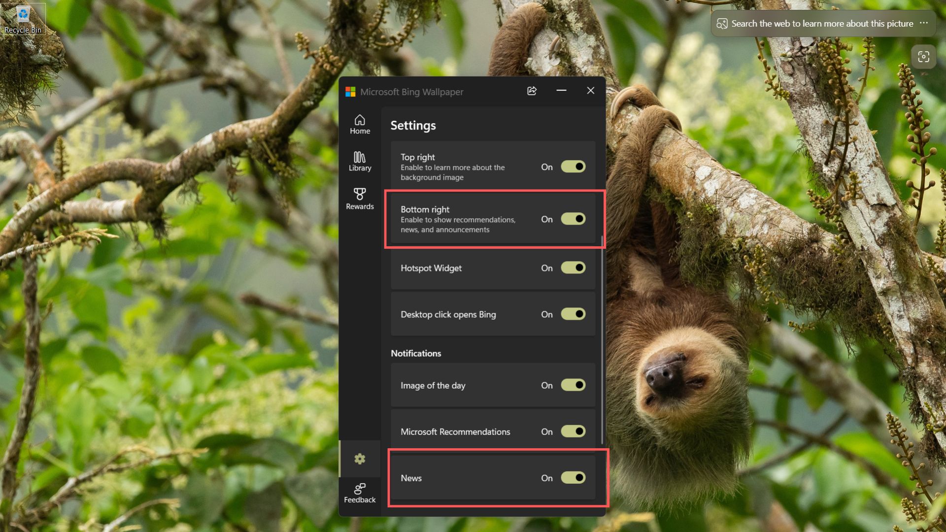 These weren’t the only options turned on by default. There’s the Top right visual search toggle that takes you to the browser to give more information about the desktop background in Bing.