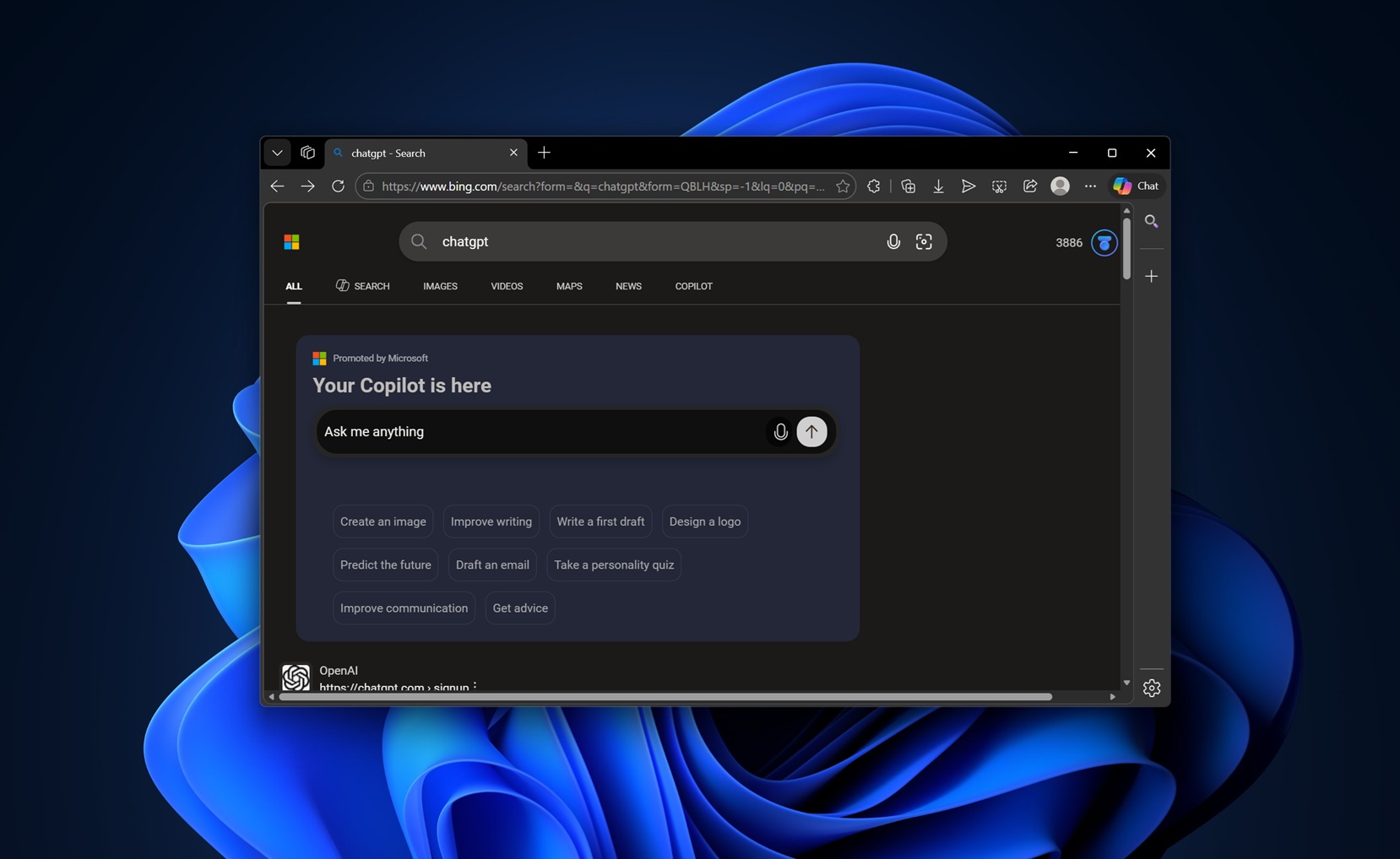 Now, the interesting part is that people search for ChatGPT, so they can create an image or draft emails. Microsoft is specifically highlighting these capabilities of Copilot, so users don’t jump to the second link, which opens ChatGPT.